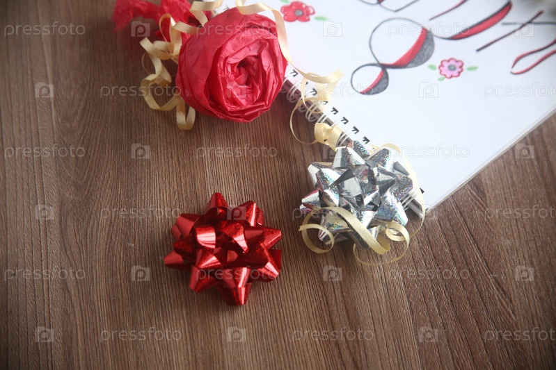 Красный и серебряный блестящие банты с ленточкой и розой крупным планом на столе