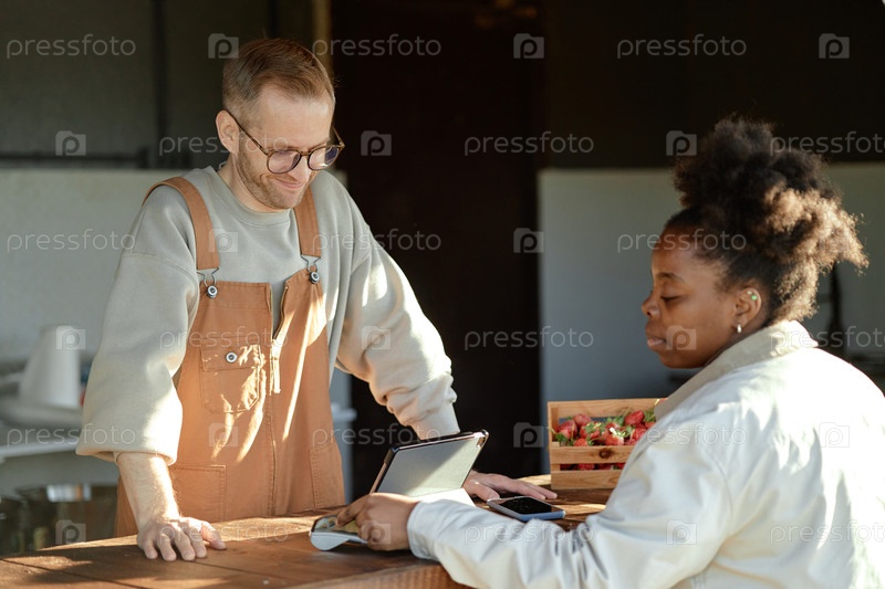 Черная молодая взрослая женщина платит картой на продовольственном рынке