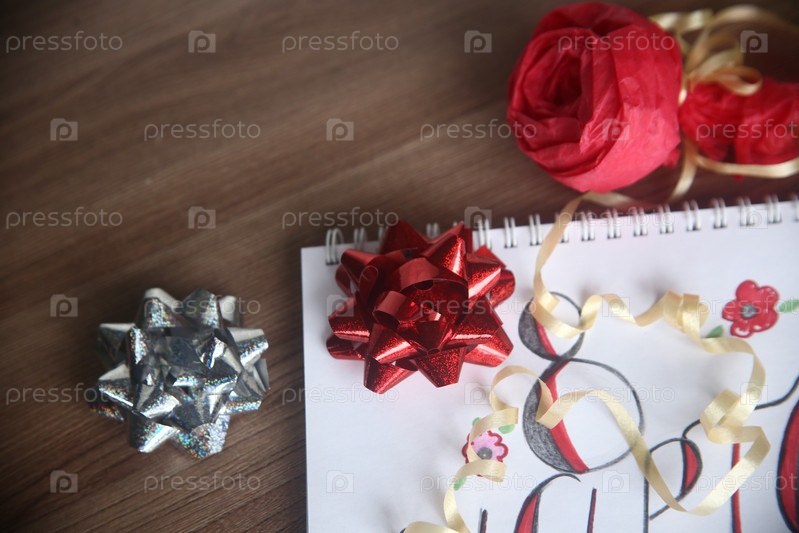 Красный и серебряный блестящие банты с ленточкой крупным планом на столе