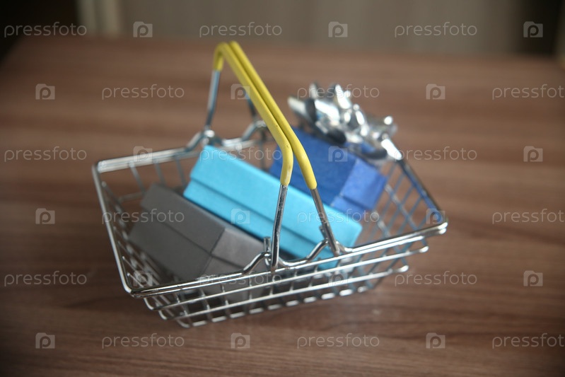 Металлическая корзина с подарочными коробками на деревянном столе крупным планом