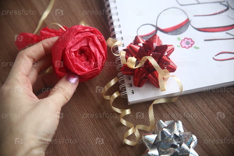 Подарочный красный бант и роза в руке крупным планом