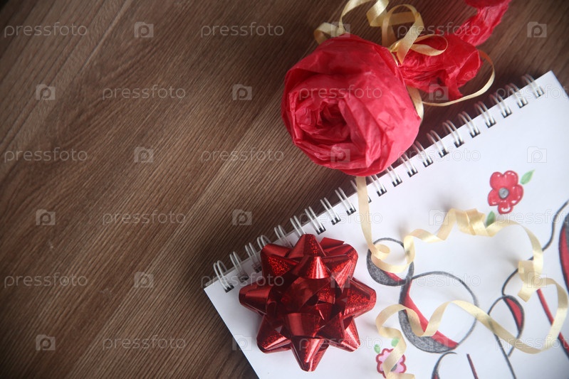 Подарочный красный бант и роза крупным планом