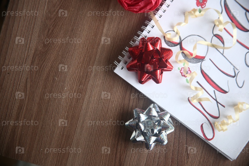 Красный и серебряный блестящие банты с ленточкой крупным планом на столе