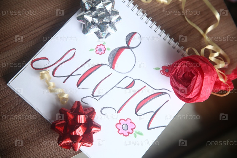 Красный и серебряный блестящие банты с ленточкой крупным планом на столе