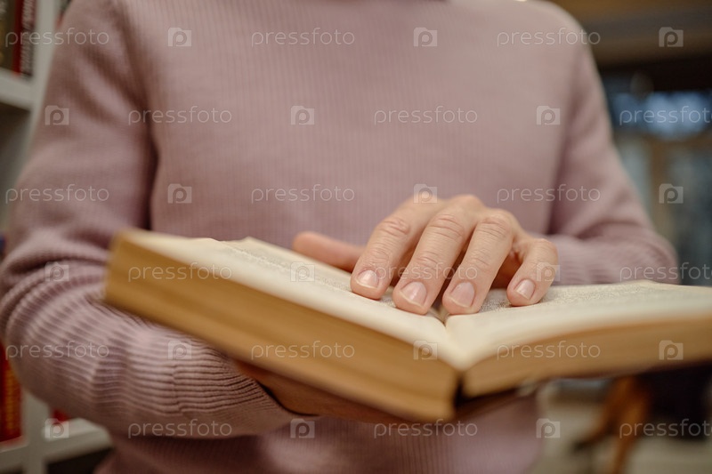 Мужчина средних лет читает книгу Брайля в библиотеке