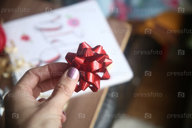 Подарочный красный бант в руке крупным планом