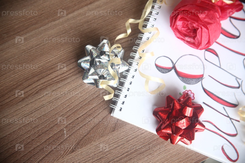 Красный и серебряный блестящие банты с ленточкой крупным планом на столе