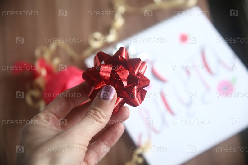Подарочный красный бант в руке крупным планом