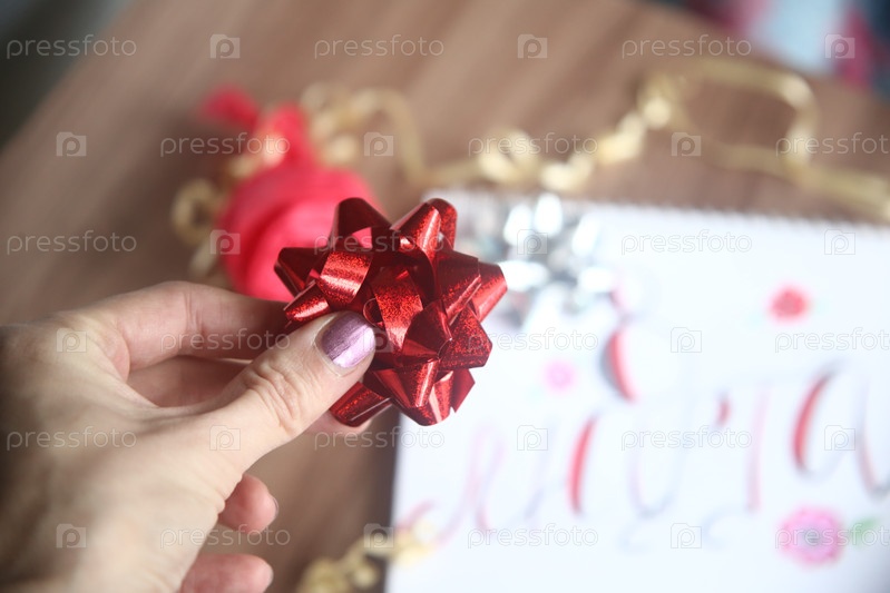 Подарочный красный бант в руке крупным планом