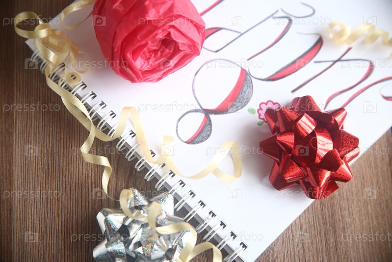 Красный и серебряный блестящие банты с ленточкой крупным планом на столе