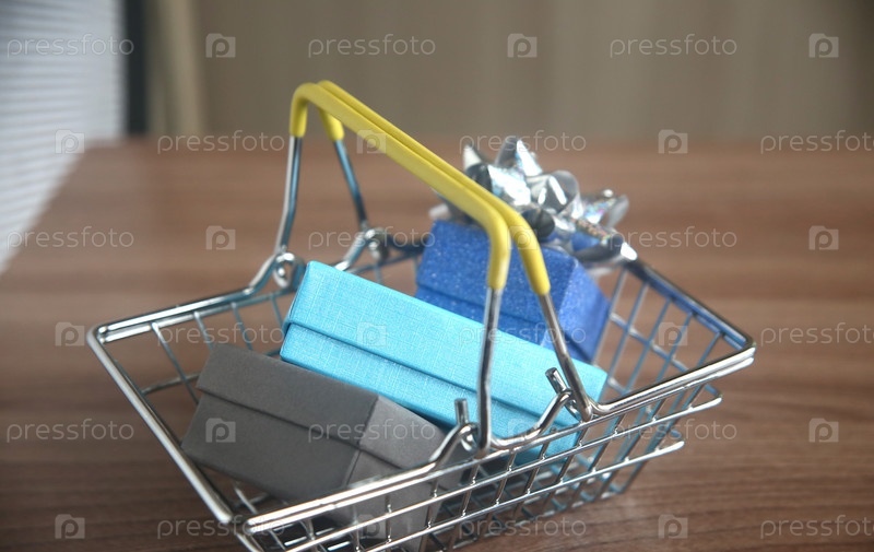 Металлическая корзина с подарочными коробками на деревянном столе крупным планом