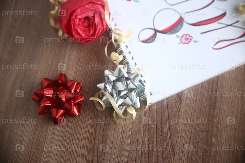 Красный и серебряный блестящие банты с ленточкой крупным планом на столе