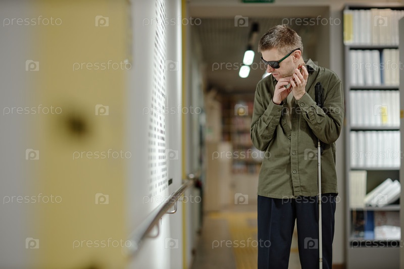 Молодой человек использует трость для навигации по библиотеке в качестве слепого человека