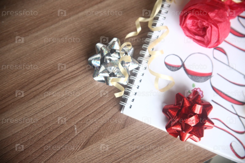 Красный и серебряный блестящие банты с ленточкой крупным планом на столе