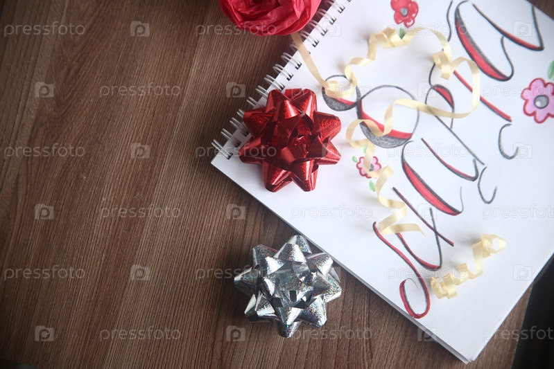 Красный и серебряный блестящие банты с ленточкой крупным планом на столе