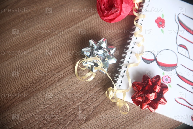 Красный и серебряный блестящие банты с ленточкой крупным планом на столе