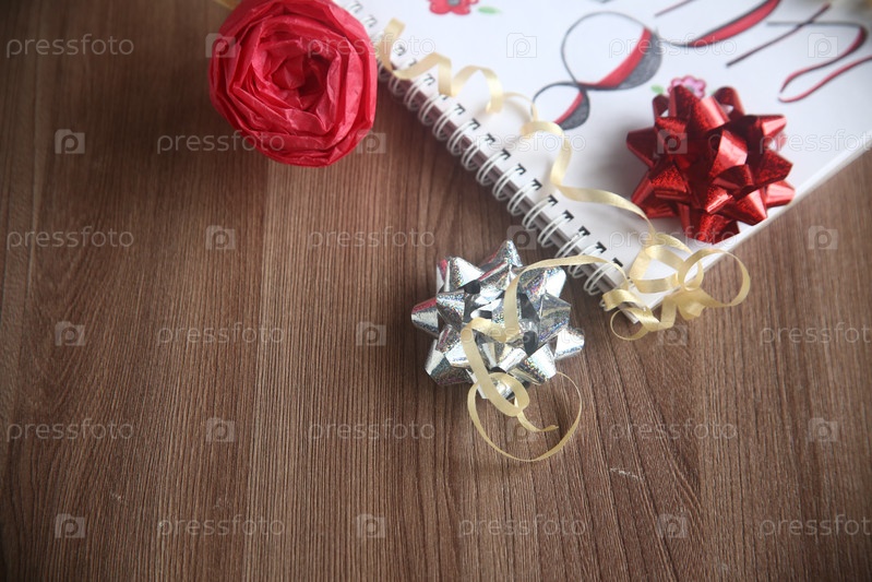 Красный и серебряный блестящие банты с ленточкой крупным планом на столе