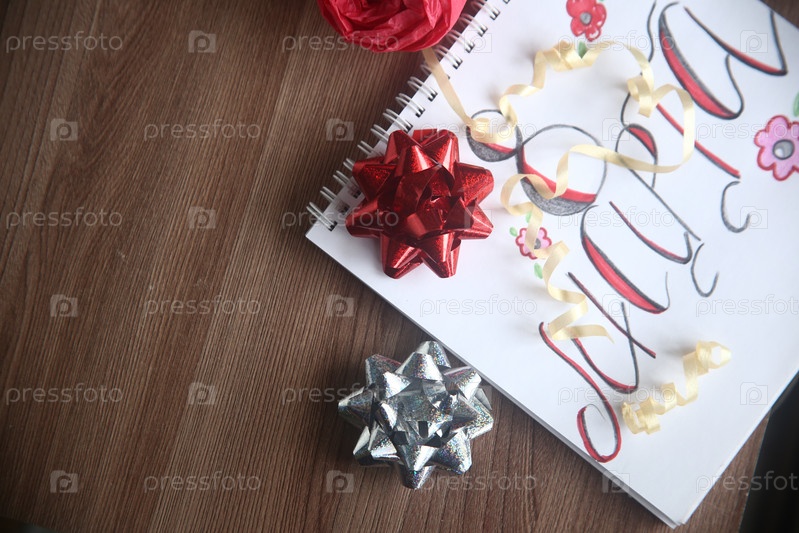 Красный и серебряный блестящие банты с ленточкой крупным планом на столе