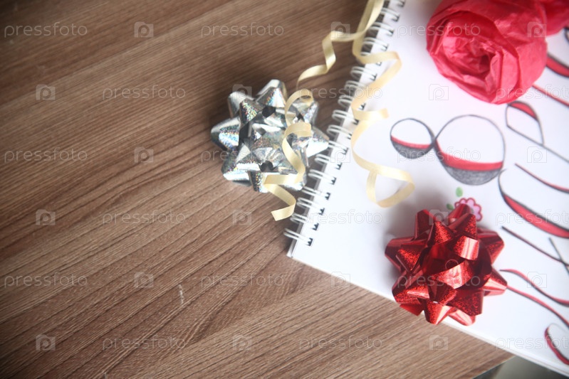 Красный и серебряный блестящие банты с ленточкой крупным планом на столе