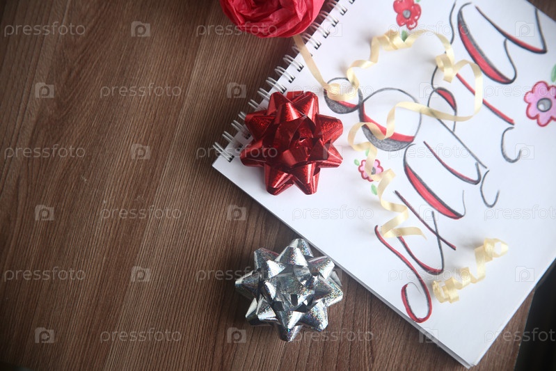 Красный и серебряный блестящие банты с ленточкой крупным планом на столе
