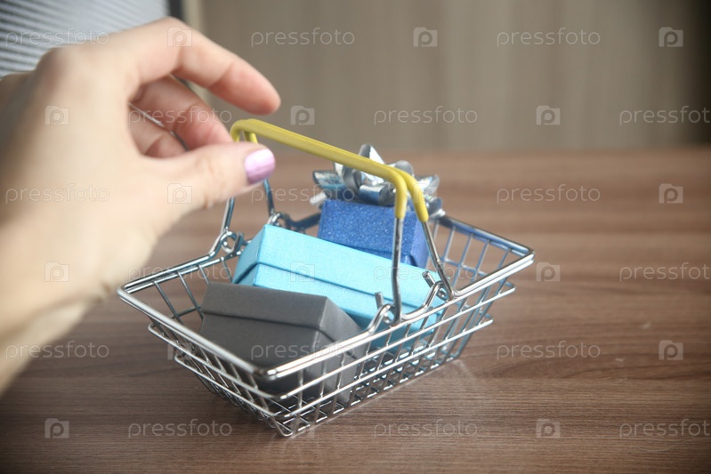 Металлическая корзина с подарочными коробками в руке крупным планом