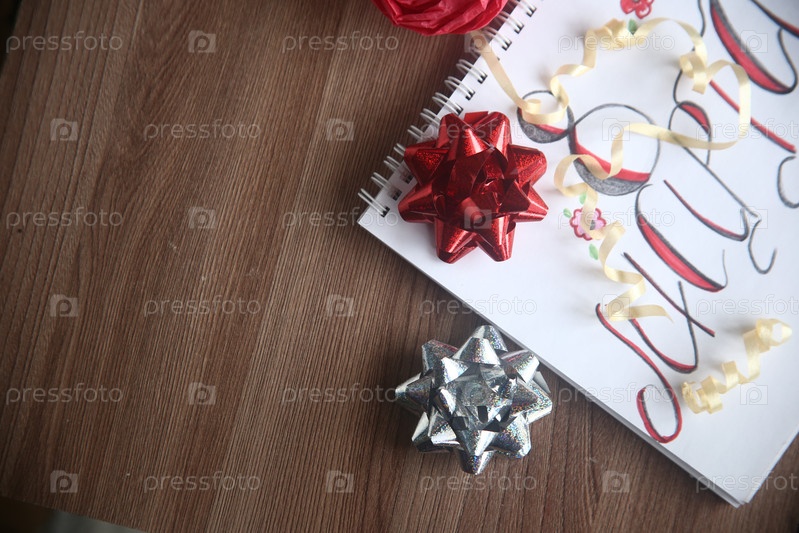 Красный и серебряный блестящие банты с ленточкой крупным планом на столе