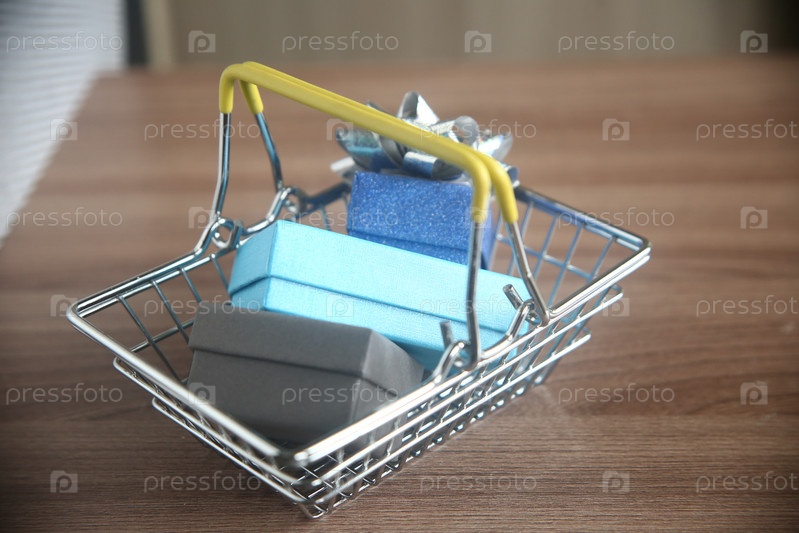Металлическая корзина с подарочными коробками на столе крупным планом