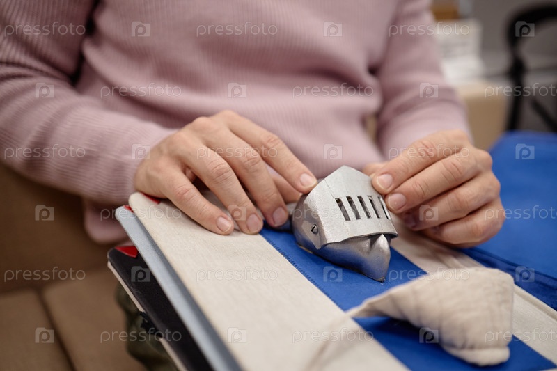 Человек читает тактильную книгу с моделью шлема рыцаря