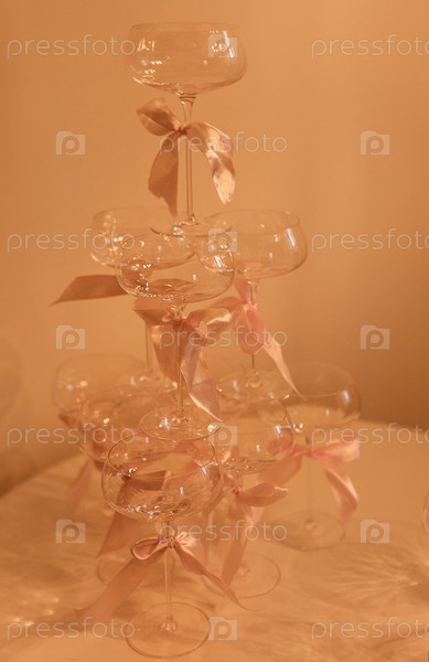 Накопленные бокалы шампанского с розовыми лентами, расположенными элегантно на столе, мягкое освещение создает теплую атмосферу для празднования или специального мероприятия