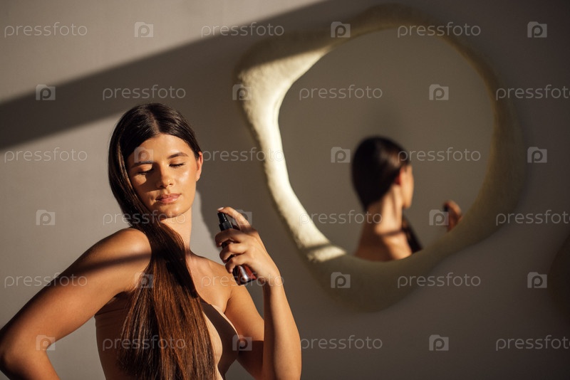 Молодая женщина с длинными темными волосами наносит средства для волос перед уникальным зеркалом, демонстрируя рутину красоты и самообслуживание в спокойной помещенной среде с мягким освещением