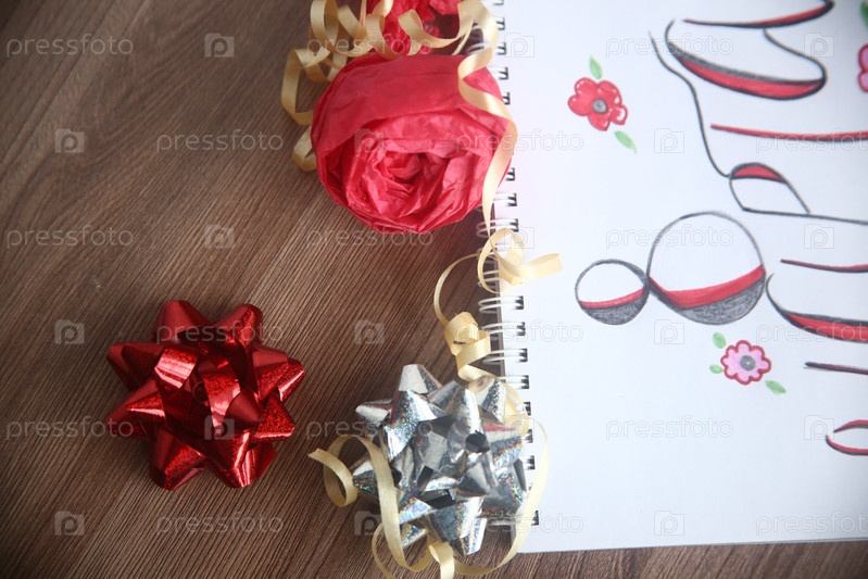 Красный и серебряный блестящие банты с ленточкой крупным планом на столе