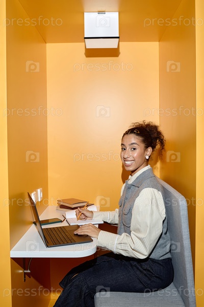 Молодая взрослая мультиэтническая женщина, использующая ноутбук и записывающая заметки в книжном кабинете