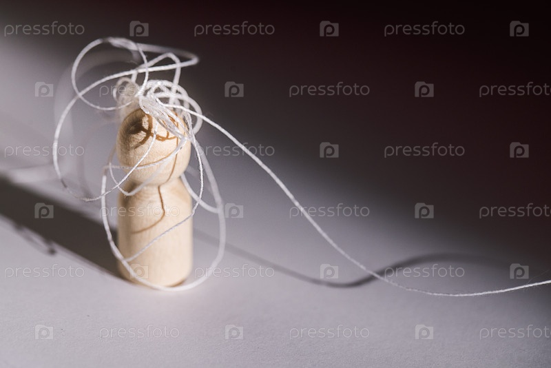 Деревянная статуэтка с запутанной белой нитью на серой поверхности, демонстрирующая сложные детали и тени в минималистической композиции