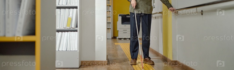Слепой человек ориентируется по коридору библиотеки с помощью трости и железной дороги