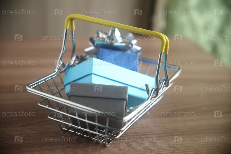 Металлическая корзина с подарочными коробками на деревянном столе крупным планом