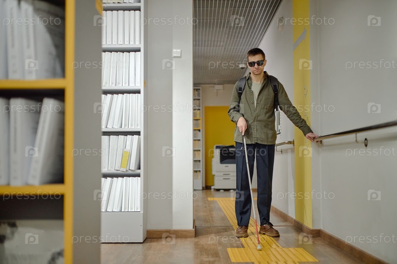Молодой взрослый мужчина ориентируется по коридору библиотеки, используя трость и рельсы