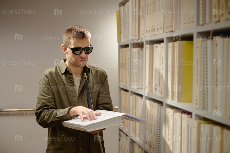 Молодой мужчина читает книгу Брайля самостоятельно в библиотеке