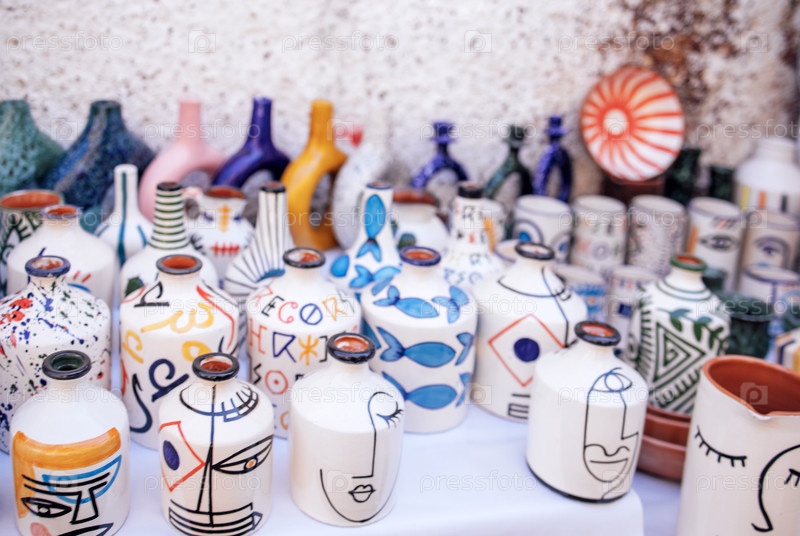 Красочные керамические вазы с художественными рисунками и узорами расположены на столе, демонстрируя уникальное мастерство и яркие цвета в декоративном дисплее