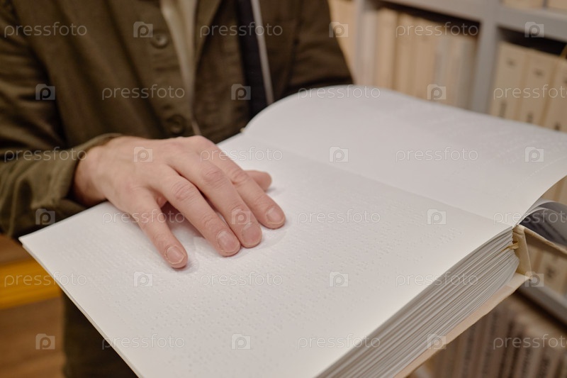 Человек средних лет читает книгу Брайля в библиотечной среде