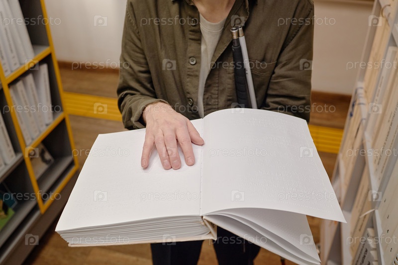 Мужчина средних лет читает книгу Брайля в библиотеке, стоя