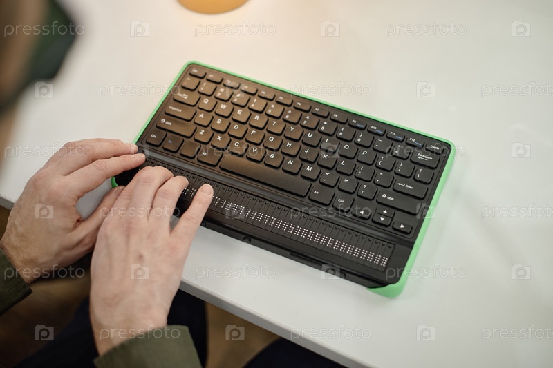 Молодой взрослый мужчина использует клавиатуру Брайля во время чтения в библиотеке