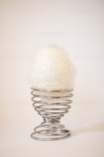 Белое декоративное яйцо, упакованное в прозрачный пластик, опирается на серебряный металлический держатель для яиц на мягком нейтральном фоне