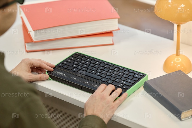 Мужчина средних лет использует клавиатуру Брайля во время учебы в библиотеке