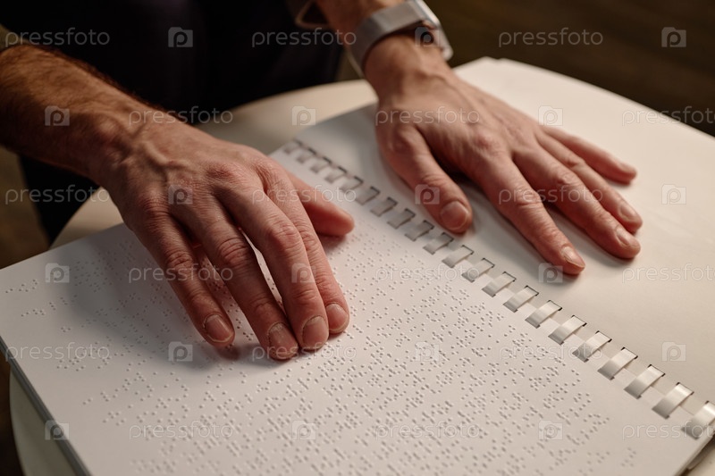 Человек читает книгу Брайля руками в библиотеке