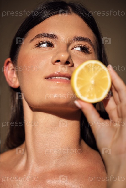 Молодая женщина с длинными темными волосами держит свежий лимон рядом со своим лицом, демонстрируя яркие цвета и естественную красоту в мягком теплом освещении, подчеркивая свежесть и жизнеспособность