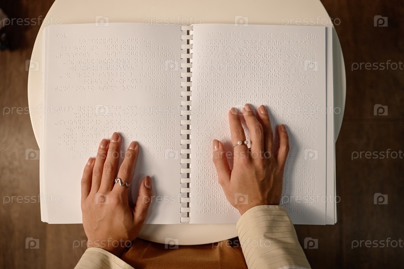 Молодая взрослая женщина читает учебник Брайля с руками в библиотеке