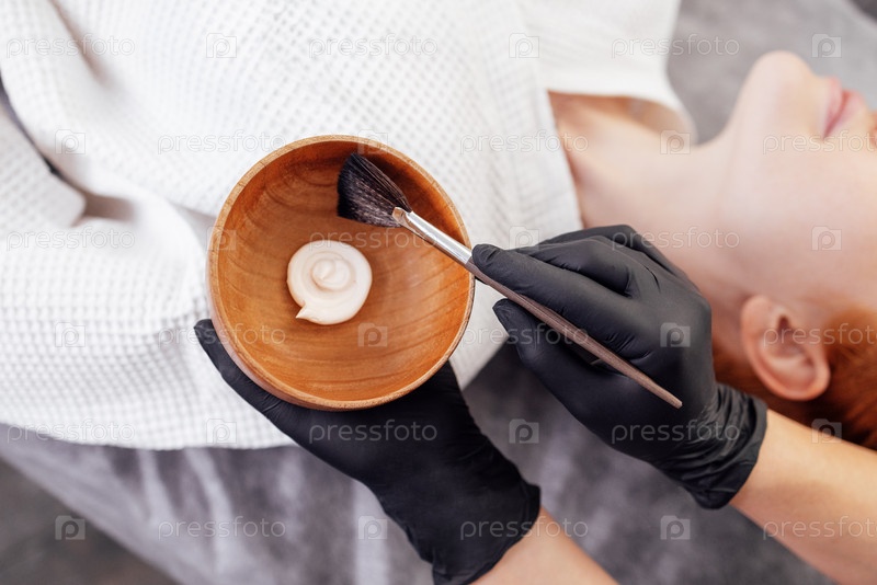 Феминистка-терапевт красоты, применяющая уход за лицом с помощью кисти, держащая миску крема, надевая черные перчатки в спокойной спа среде, демонстрируя процесс ухода за кожей и расслабление