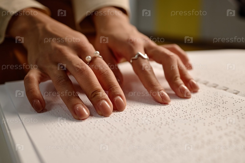 Ключевое изображение молодой взрослой женщины, читающей страницы Брайля в библиотечной обстановке