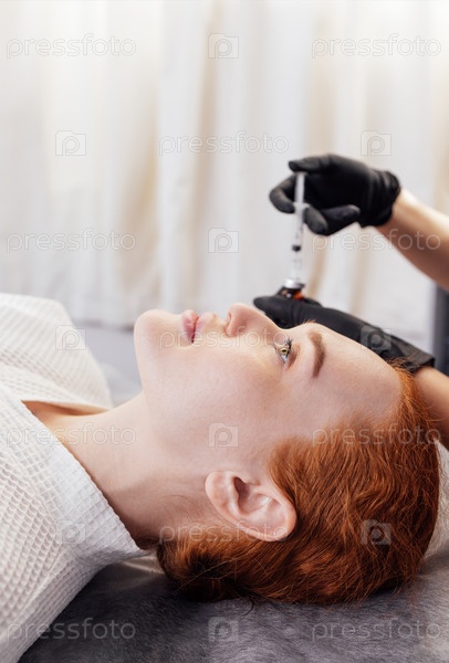 Женщина с рыжими волосами получает лечение лица в спа-салоне, а профессионал наносит сыворотку с помощью шприца, демонстрируя техники ухода за кожей и релаксации