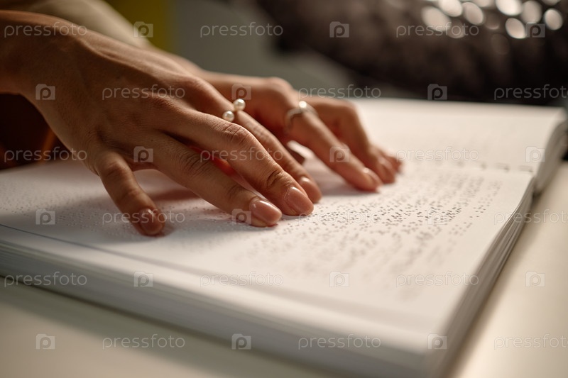 Ближайшее изображение молодой взрослой женщины, касающейся страниц Брайля во время изучения книги